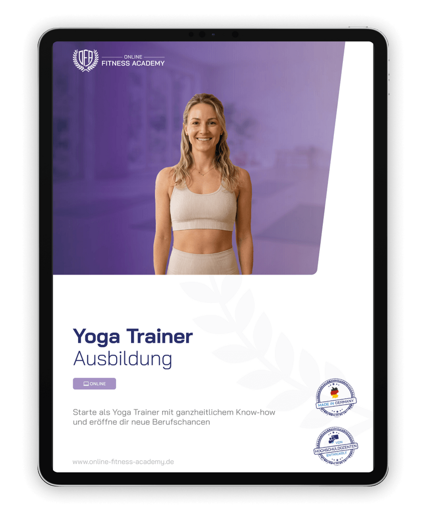 Entdecke die vielseitigen Möglichkeiten der Yoga Trainer Online Ausbildung bei der Online Fitness Academy (OFA). Im Infomaterial erfährst du, wie die Ausbildung aufgebaut ist und wie du dein Wissen rund um Yoga, Asanas, Atemtechniken, Entspannung und Unterrichtsgestaltung gezielt erweitern kannst, flexibel und bequem von zuhause aus.